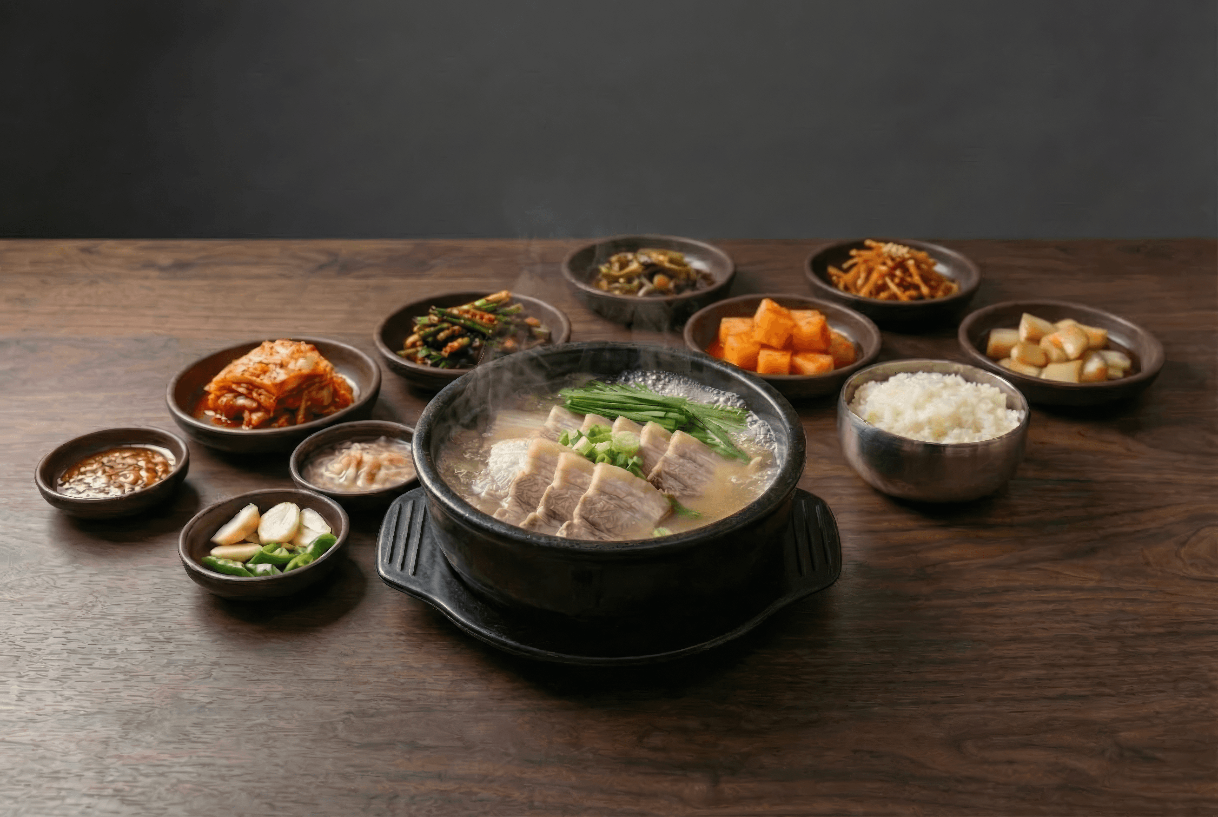 우리의 크리에이티브 접근 방식의 핵심은 '시각적 온도(Visual Temperature)'의 극대화였습니다. '진격'이라는 키워드를 시각적으로 풀기 위해, 모든 컷에서 펄펄 끓어오르는 역동적인 '김(Steam)'을 필수적인 디자인 요소로 설정했습니다. 드라마틱한 측면광과 반역광(Rim Light)을 사용하여 김의 질감과 음식의 입체감을 극적으로 부각시켰으며, 거칠고 무거운 질감의 뚝배기와 원목 테이블을 소품으로 활용해 브랜드의 진정성과 무게감을 더했습니다.