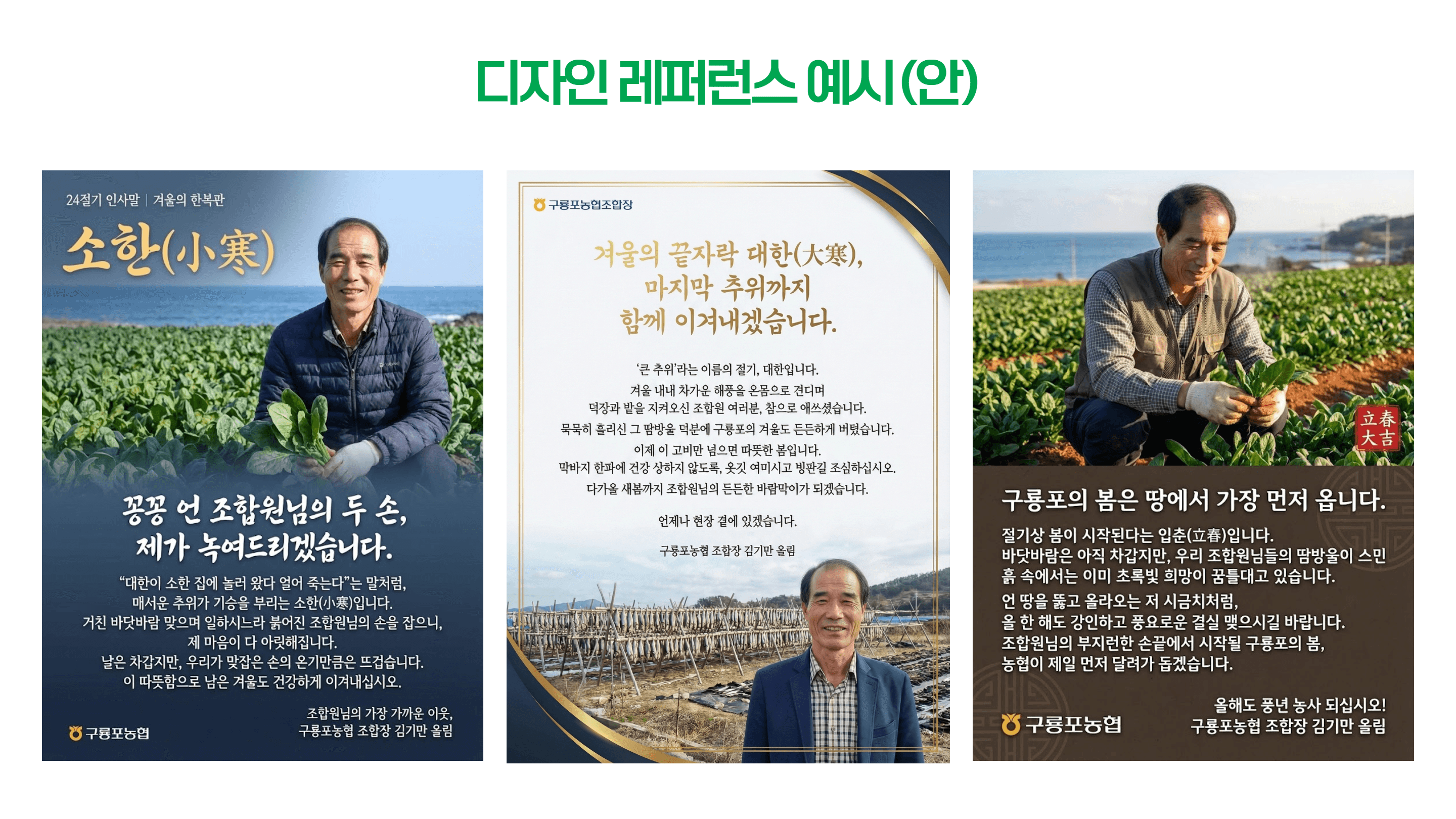 구룡포농협 조합원들과의 진정성 있는 소통을 위해 '24절기 안부 메시지'를 기획했습니다. 권위적인 관리자가 아닌, 비바람을 함께 맞는 '현장의 일꾼'이라는 핵심 콘셉트를 도출하고, 농사 일정과 날씨에 맞춘 감성적인 카피라이팅과 비주얼 전략을 통해 신뢰받는 리더십 이미지를 구축했습니다.