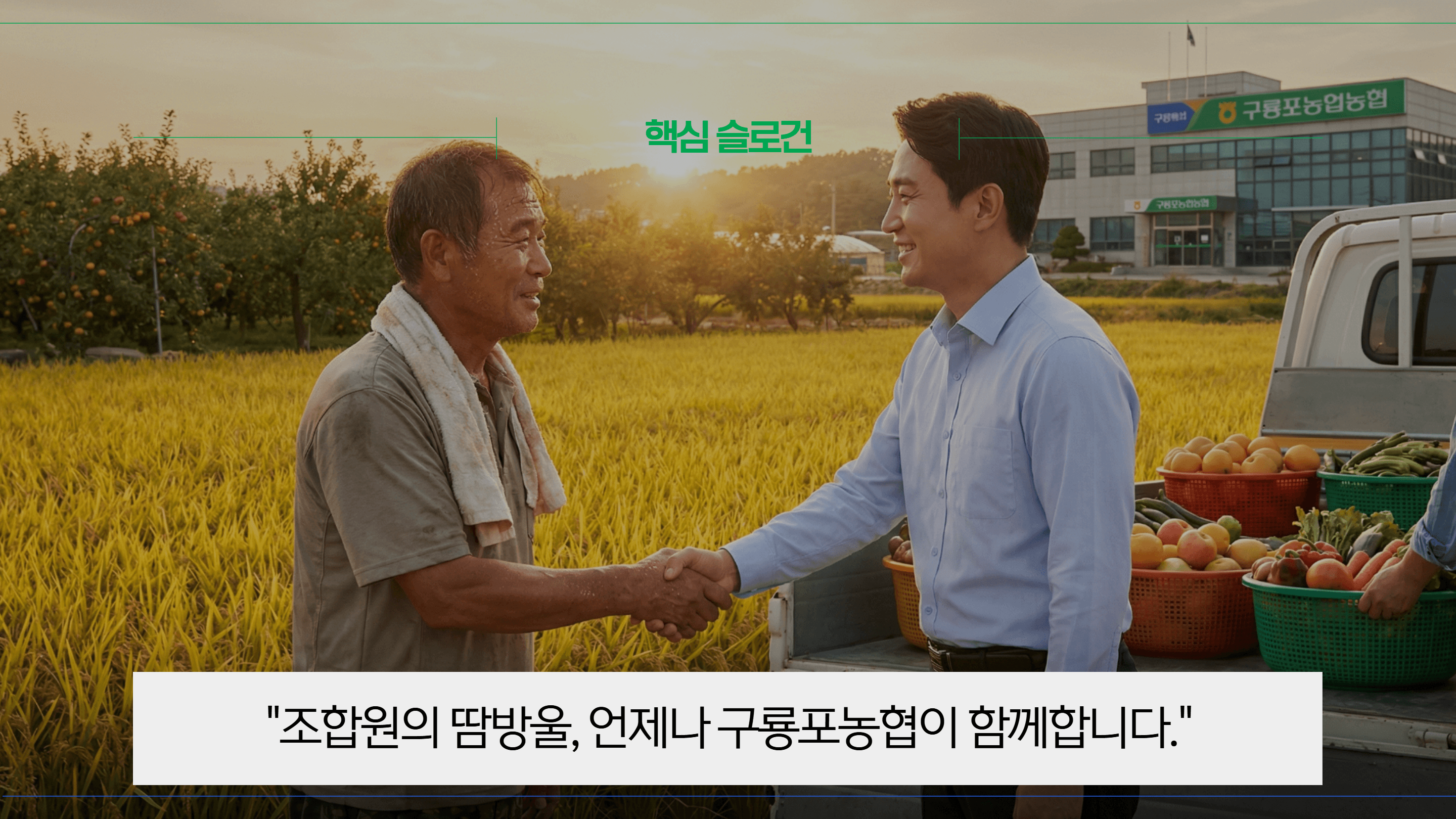 비주얼 스토리텔링: 조합원과 손을 맞잡거나(Handshake), 농작물을 직접 살피는 역동적인 이미지를 연출하여 '따뜻한 활기(Warm & Energetic)'를 전달했습니다.