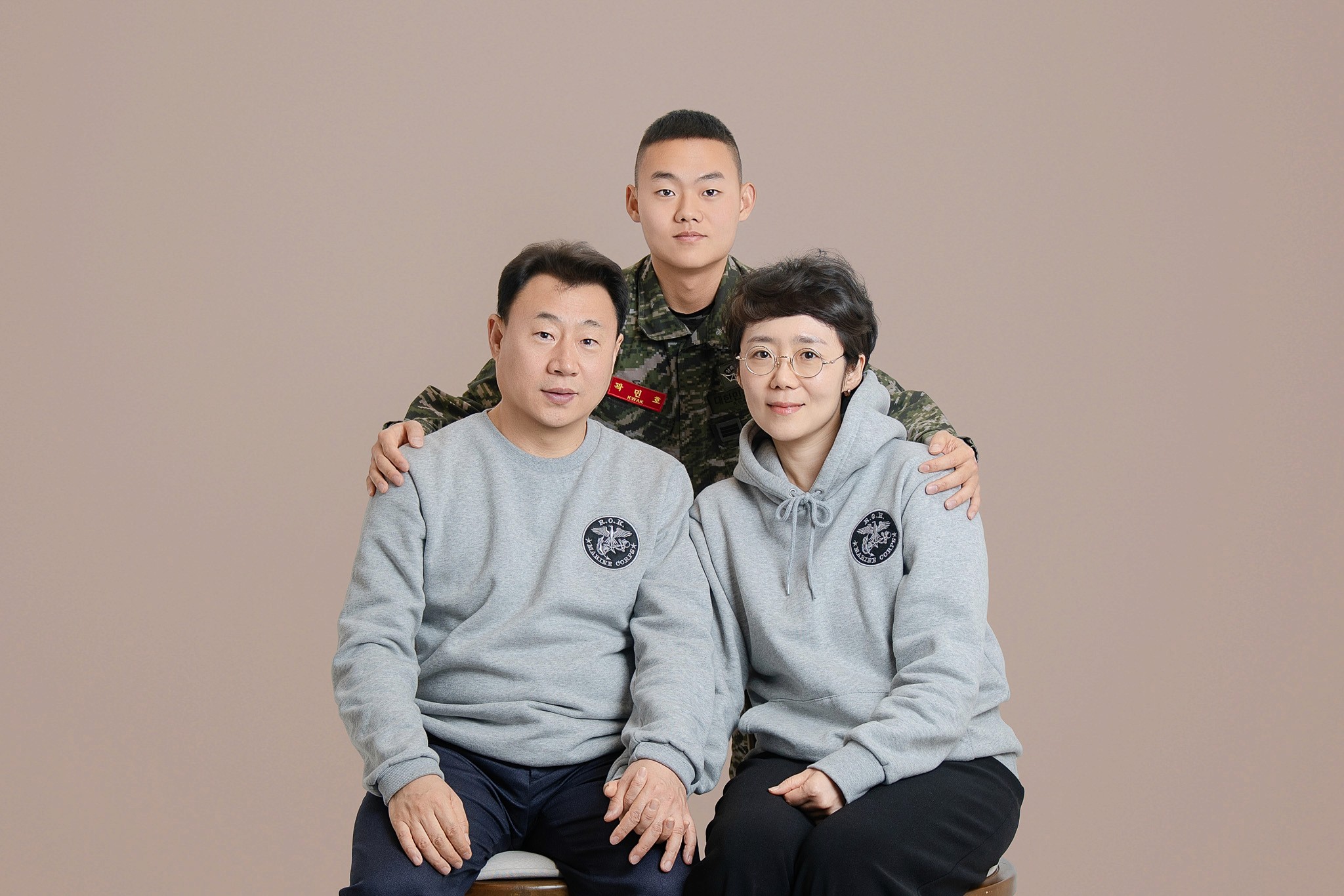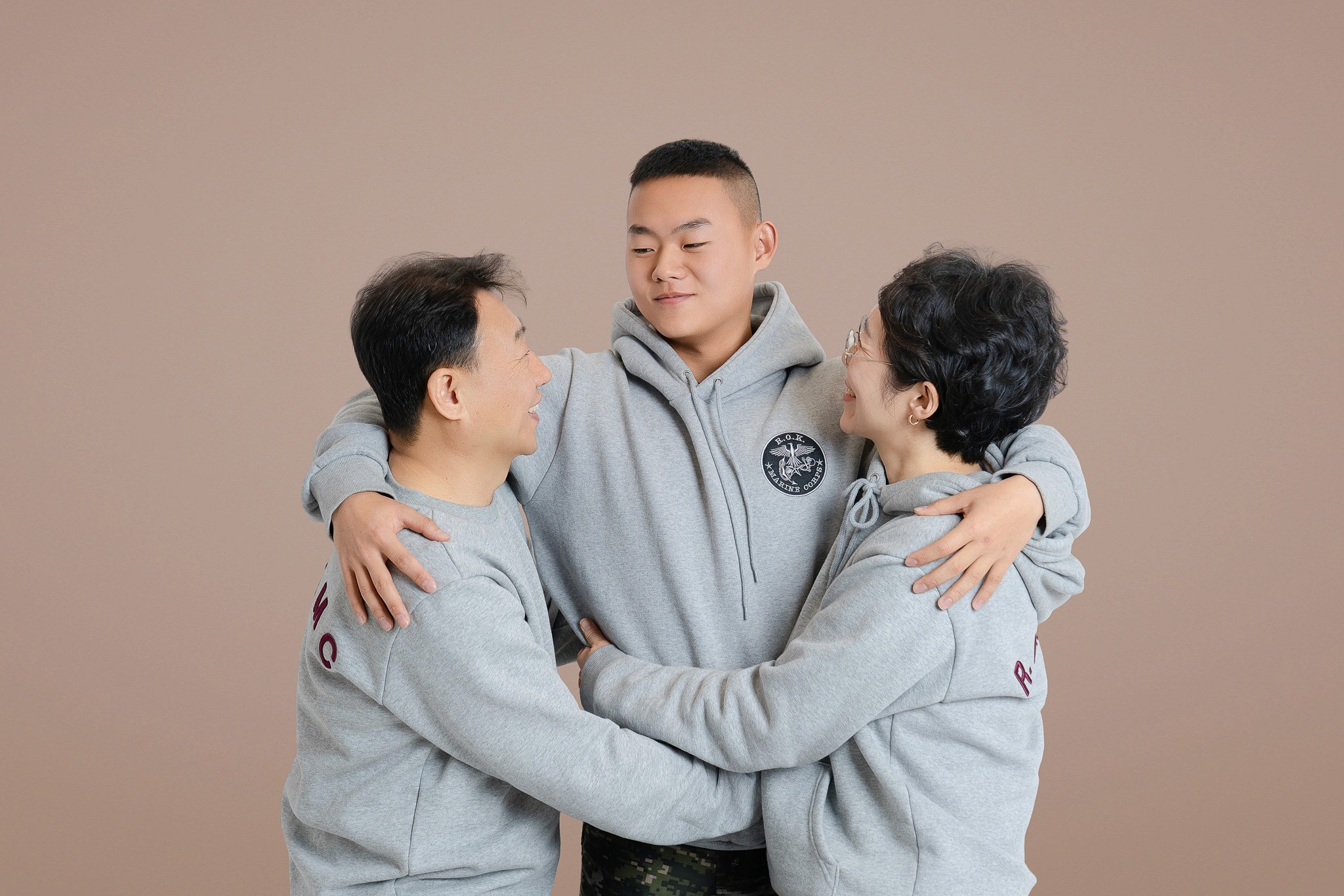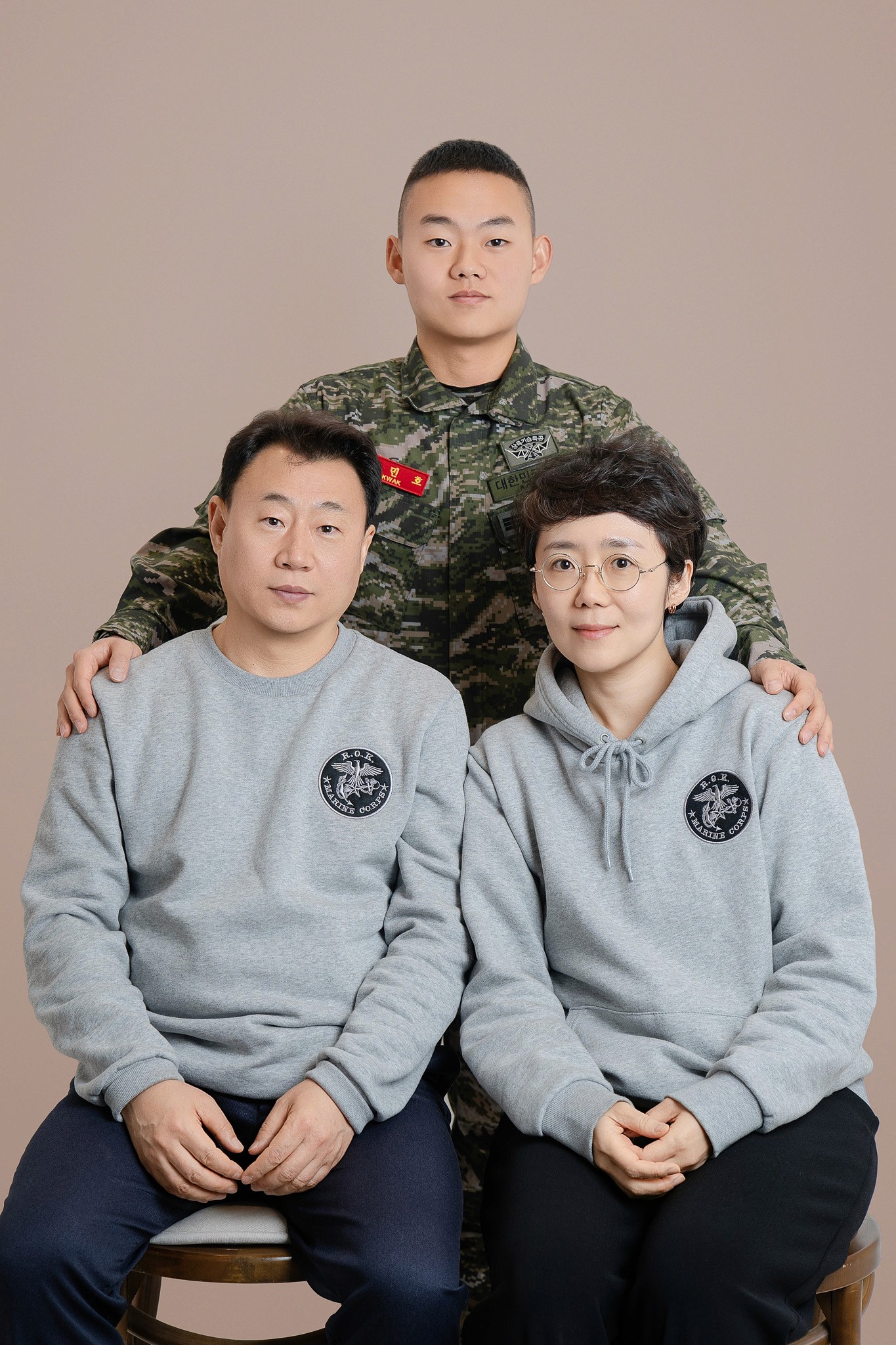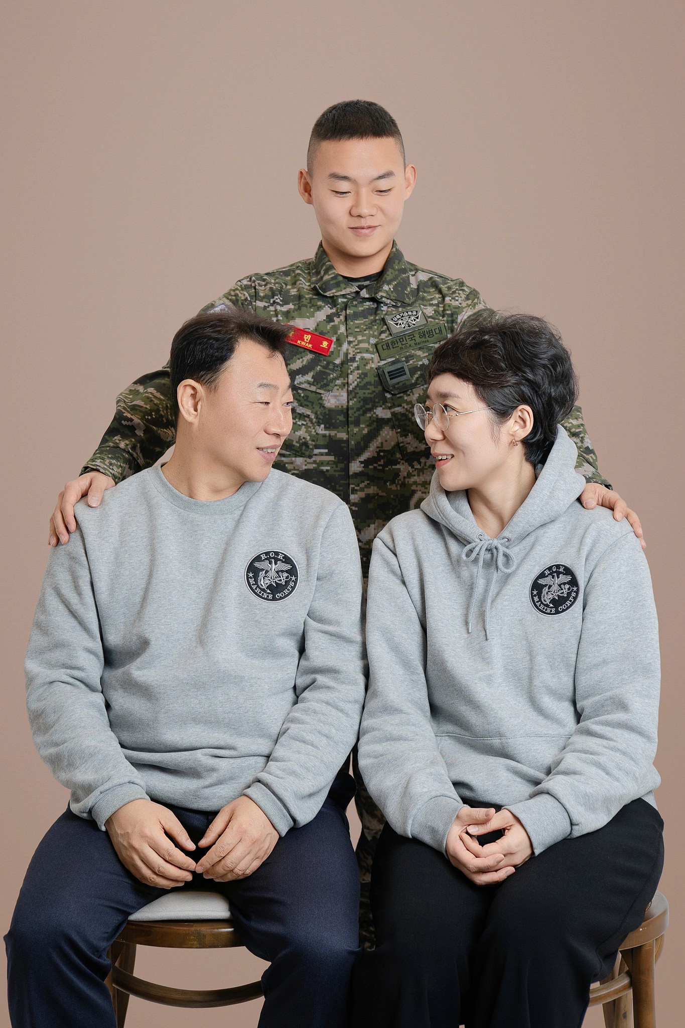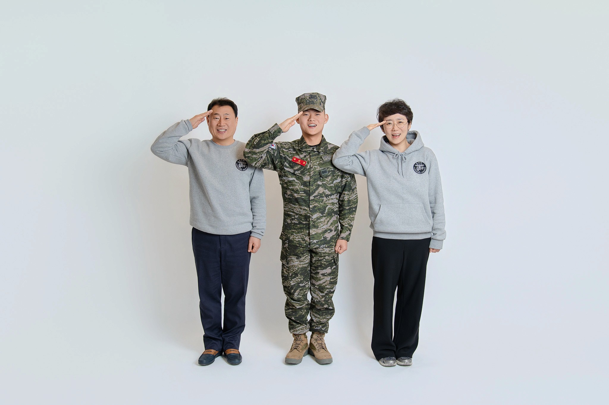 Costume Contrast: 아들의 국방 무늬 전투복과 부모님의 부드러운 그레이 톤 커플 후드티의 조화를 살려, 시각적으로 안정감 있으면서도 아들이 돋보이는 구도를 연출했습니다.