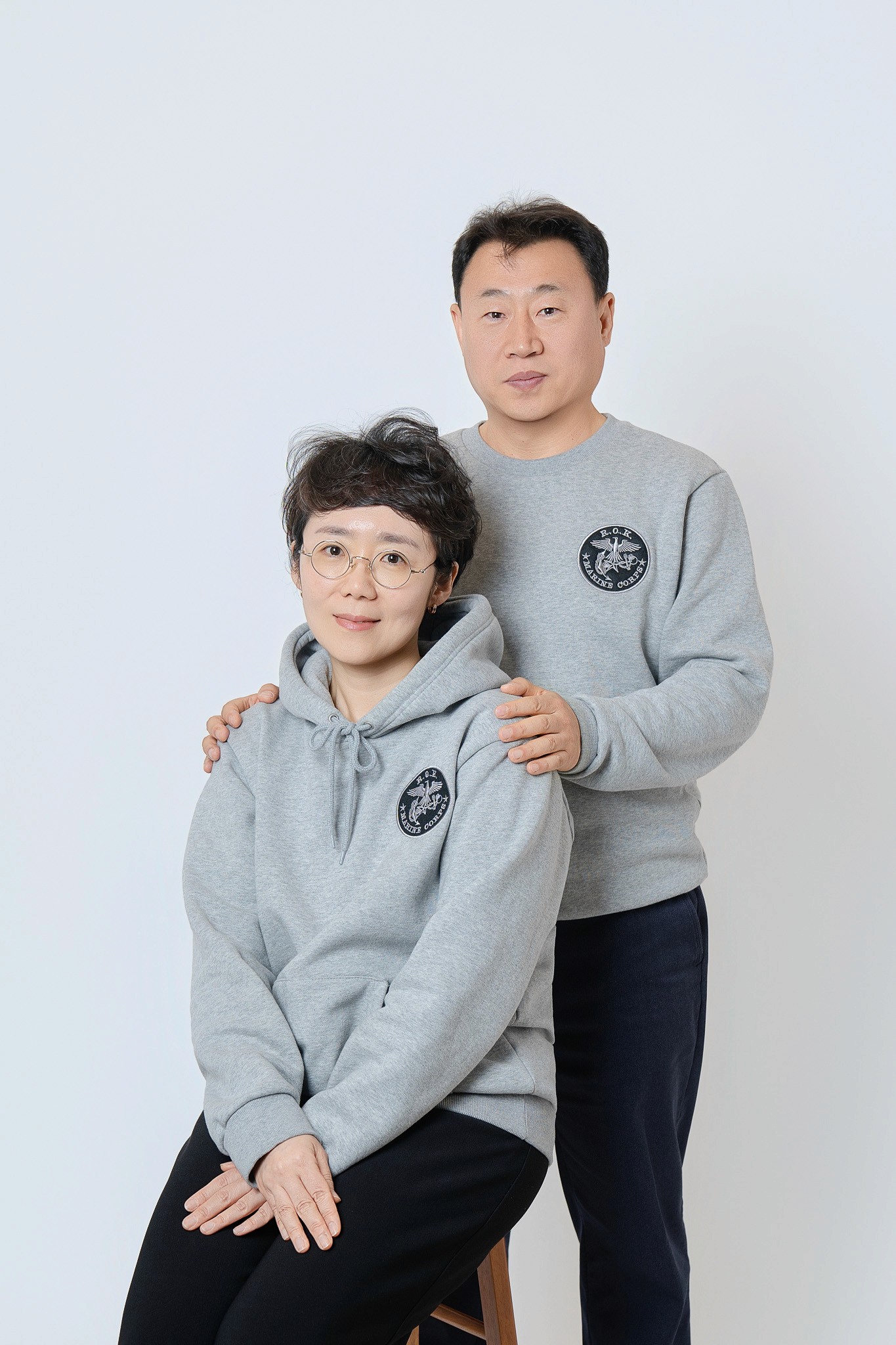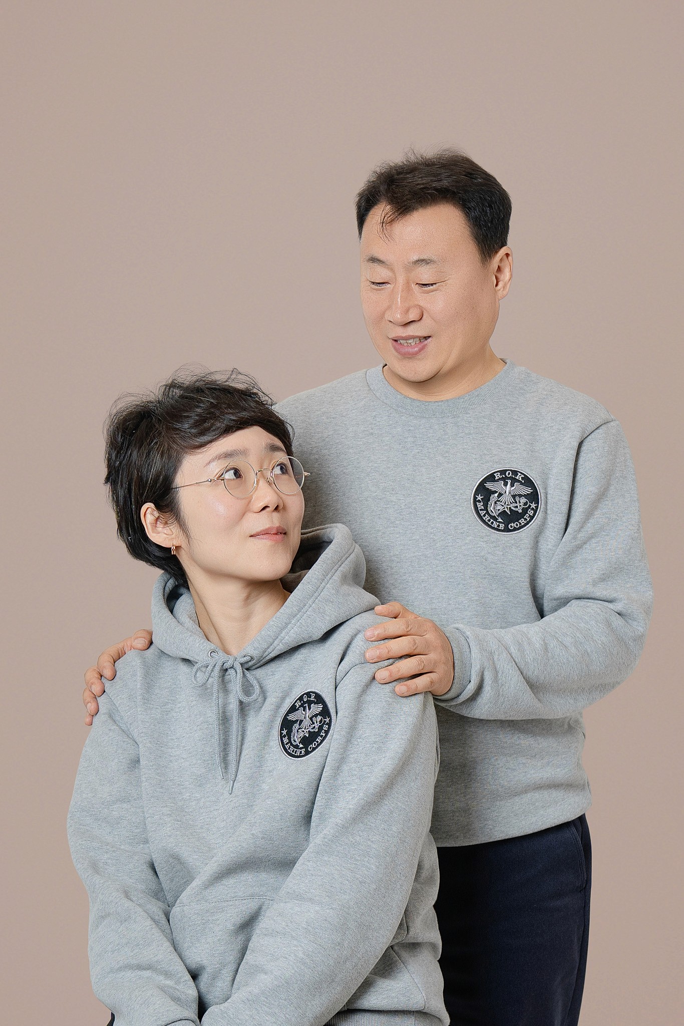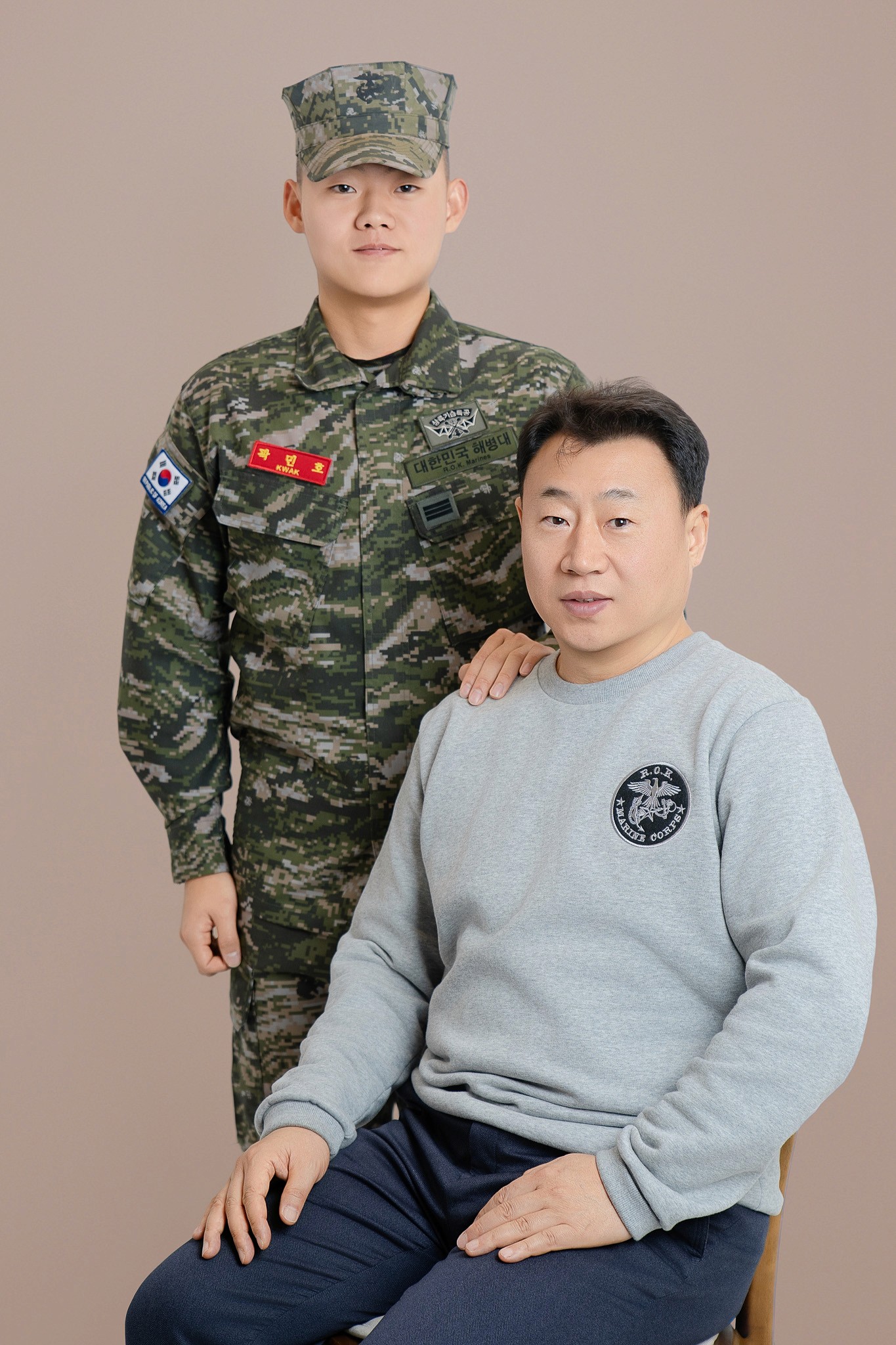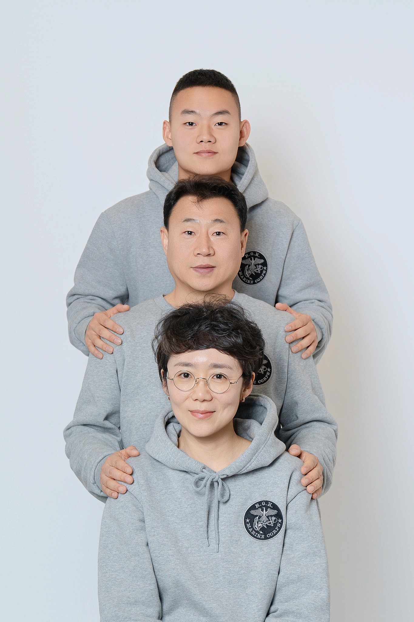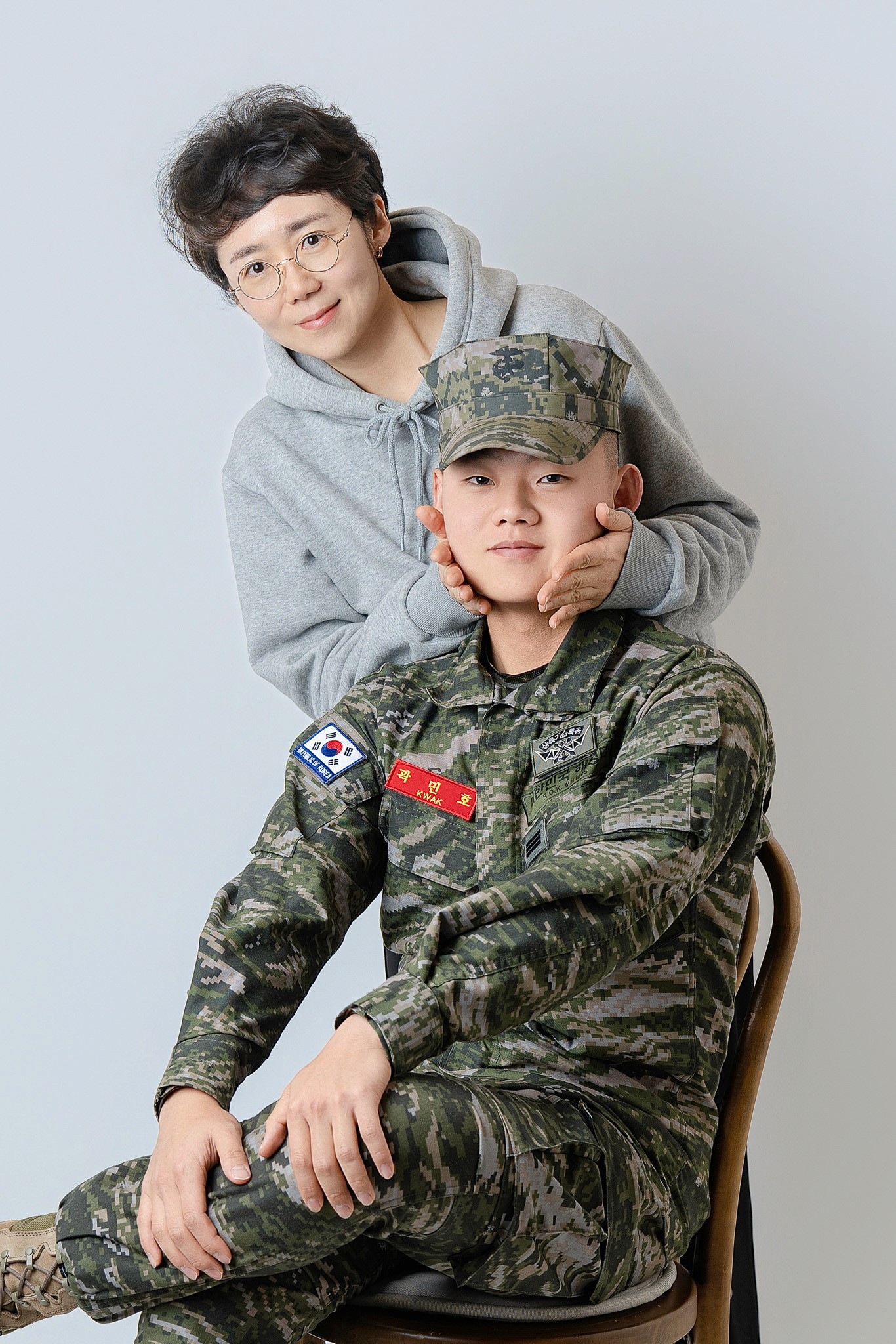 Costume Contrast: 아들의 국방 무늬 전투복과 부모님의 부드러운 그레이 톤 커플 후드티의 조화를 살려, 시각적으로 안정감 있으면서도 아들이 돋보이는 구도를 연출했습니다.