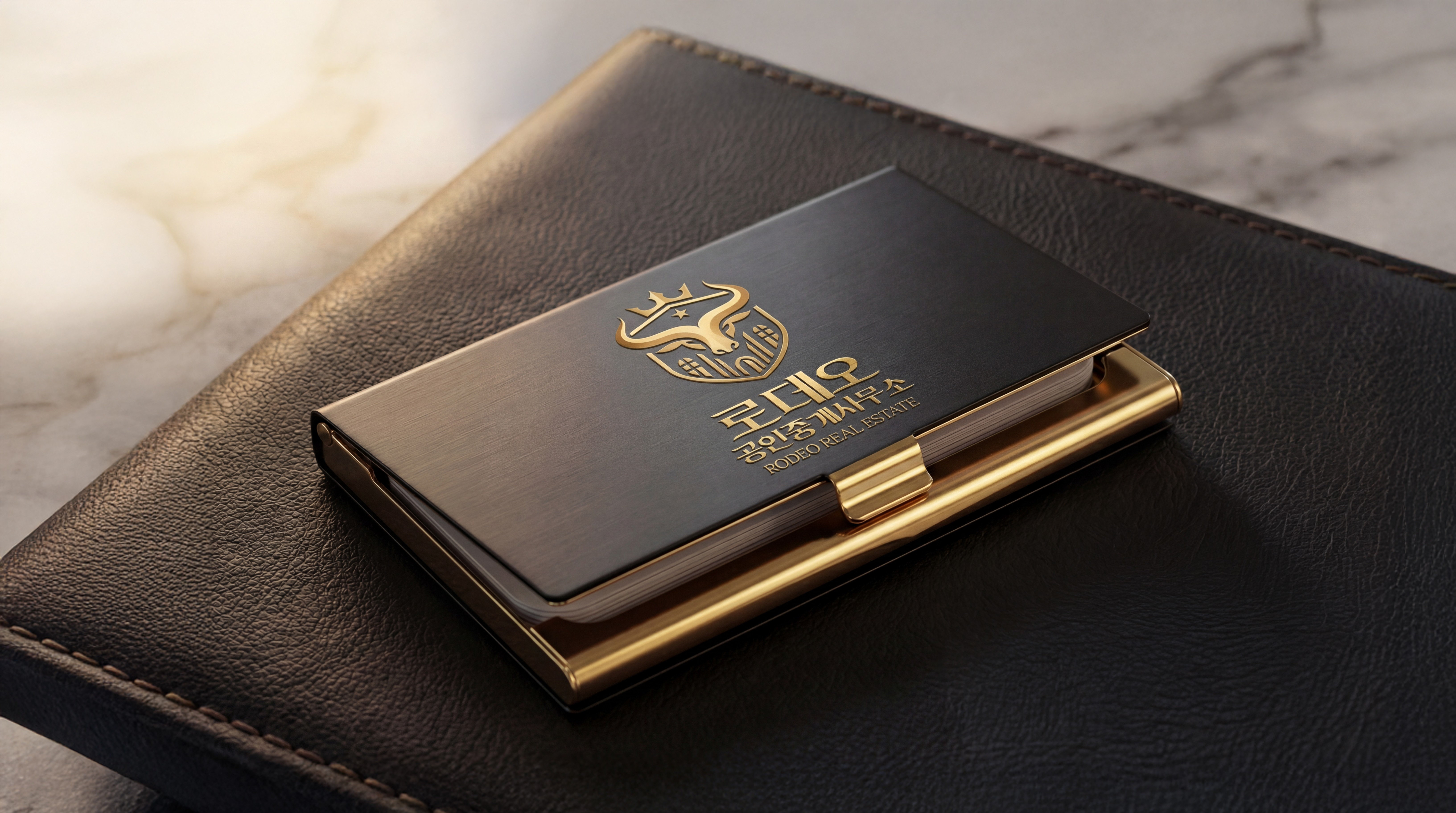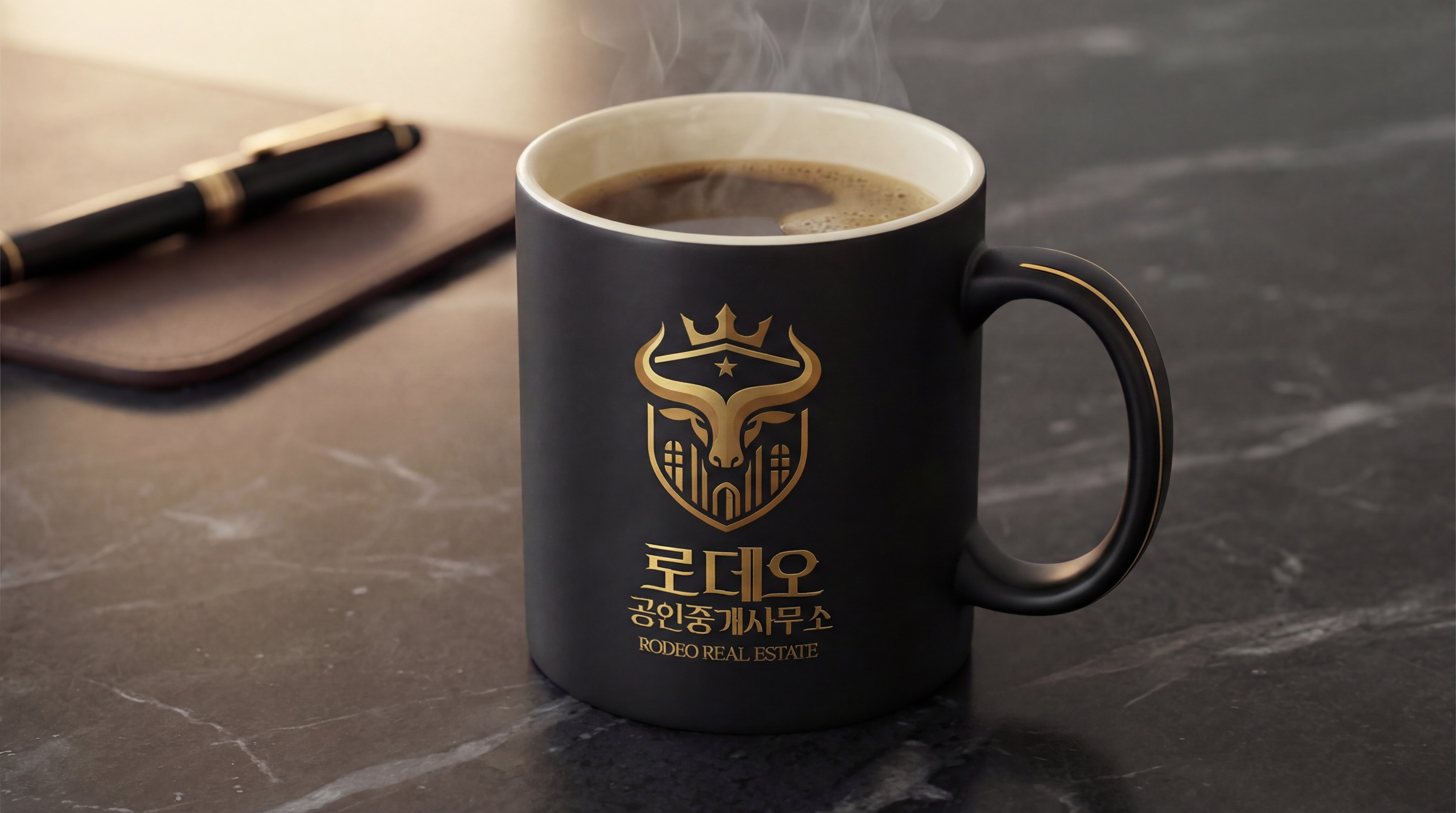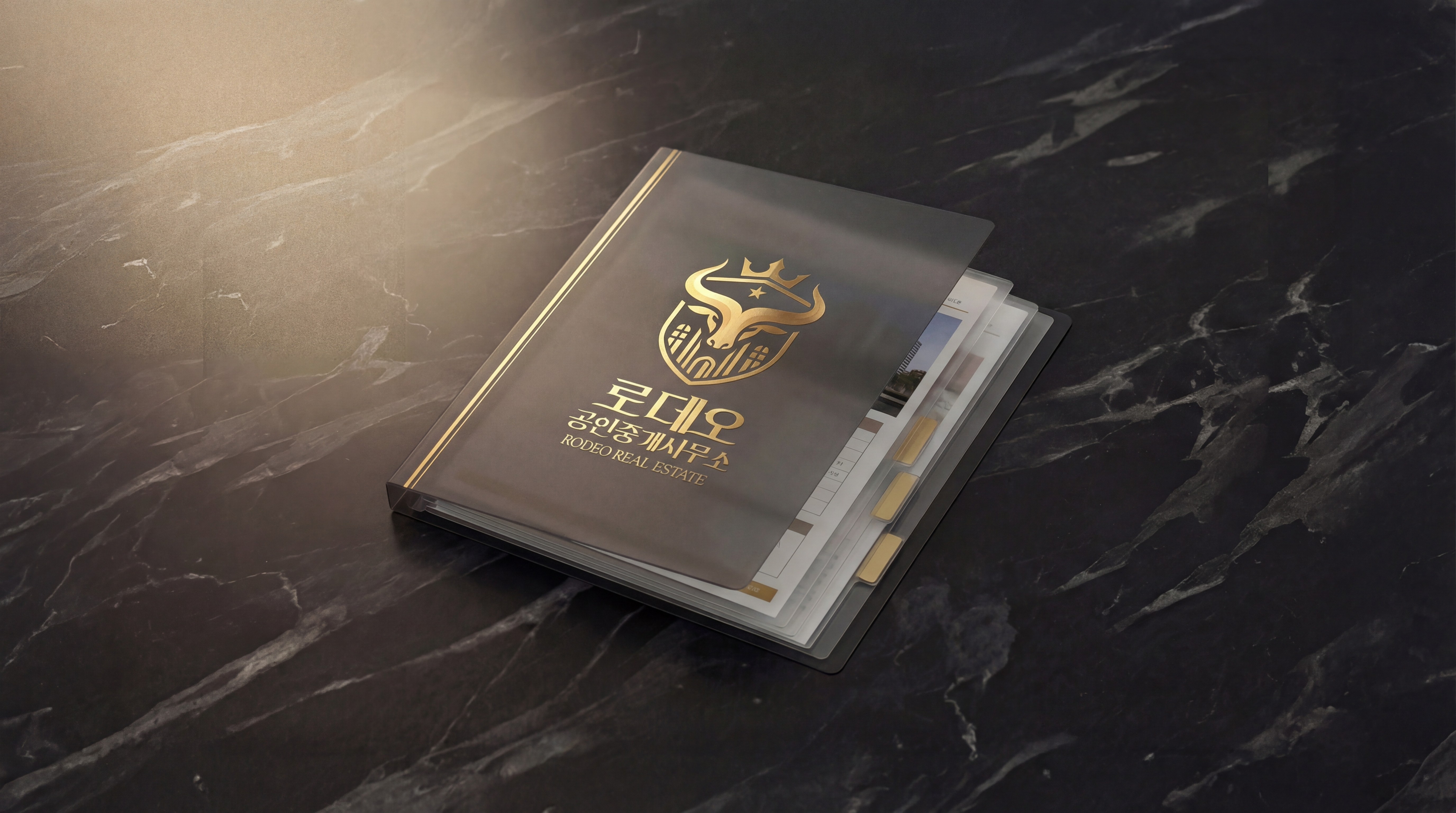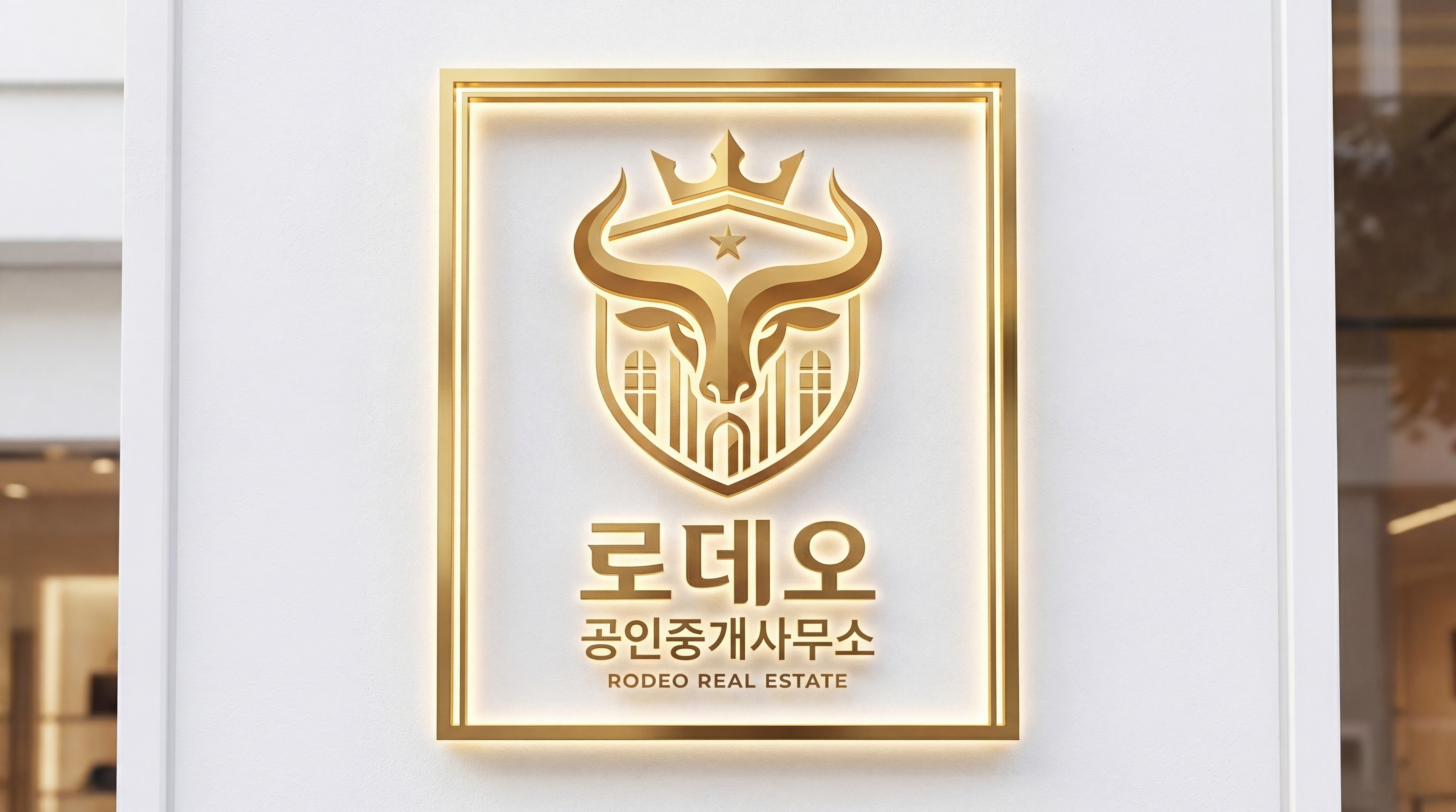 '황소'의 우직함과 '왕관'의 품격을 결합하여 로데오 공인중개사사무소만의 독보적인 브랜드 아이덴티티(BI)를 구축했습니다. 골드와 블랙 컬러를 메인으로 사용하여 고객에게 변치 않는 가치와 신뢰를 약속하는 프리미엄 부동산 브랜딩을 완성했습니다.
