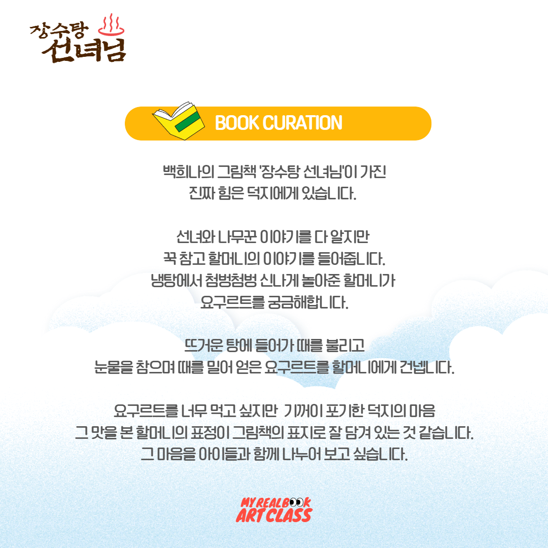 안녕하세요.우리아이가 그림책으로 세상과 소통하며 자기만의 세계관을 만들어 갈 수 있도록 돕는 '마이리얼북 아트클래스'입니다.